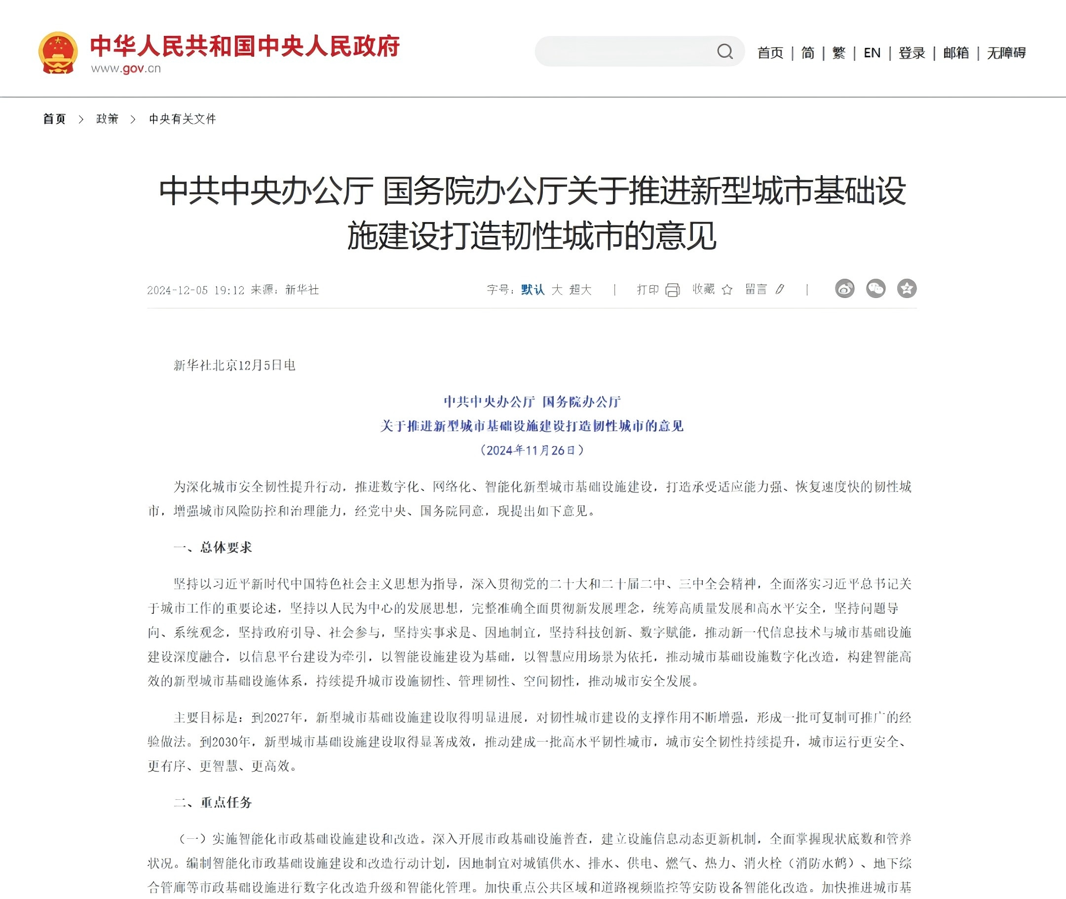 2024年12月5日,中共中央辦公廳、國(guó)務(wù)院辦公廳發(fā)布了《關(guān)于推進(jìn)新型城市基礎(chǔ)設(shè)施建設(shè)打造韌性城市的意見(jiàn)》,明...
